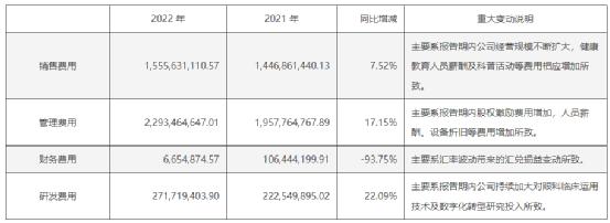 记者注意到,与个位数的营收增速相比,爱尔眼科2022年的管理费用增长较快,来到22.93亿元,比前一年增加3.5亿元以上,是三项费用中绝对值和增速都最大的一项。公司的解释是报告期内股权激励费用增加,人员薪酬和设备折旧费等增加所致。