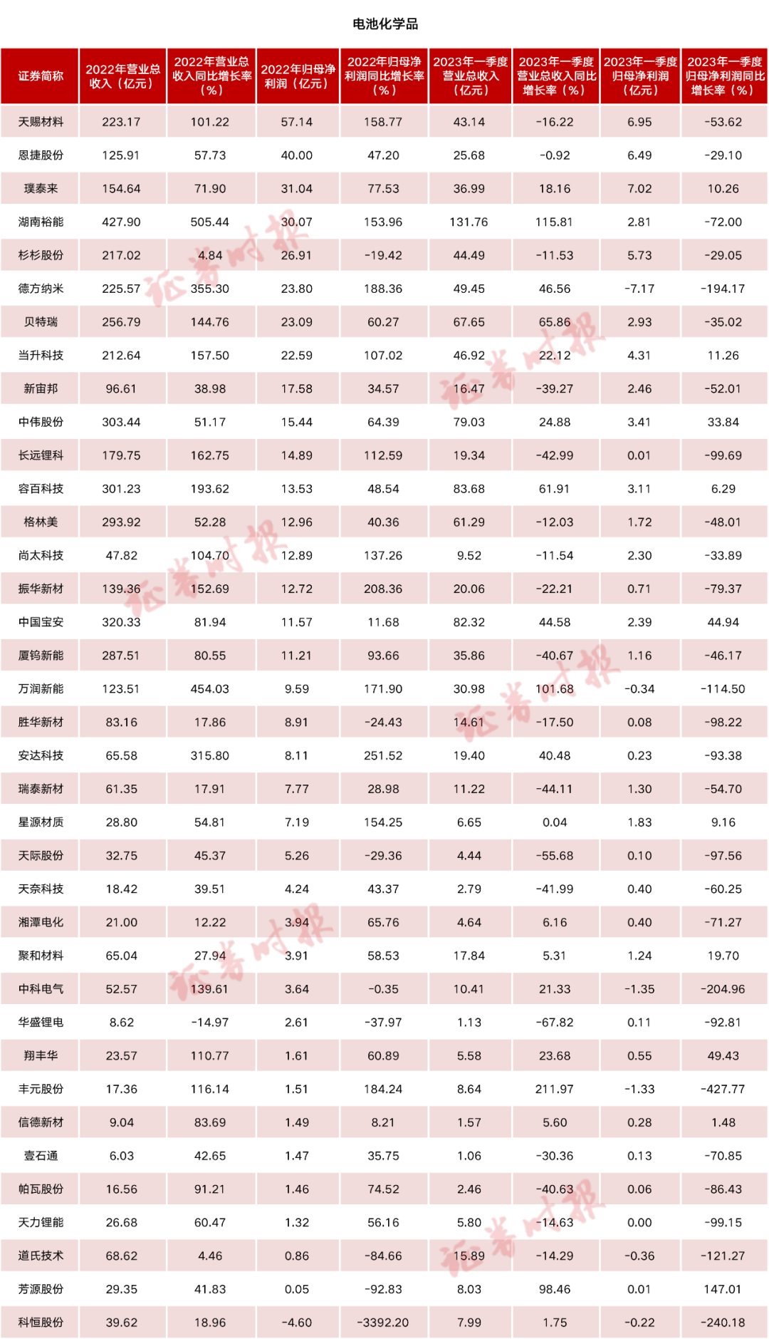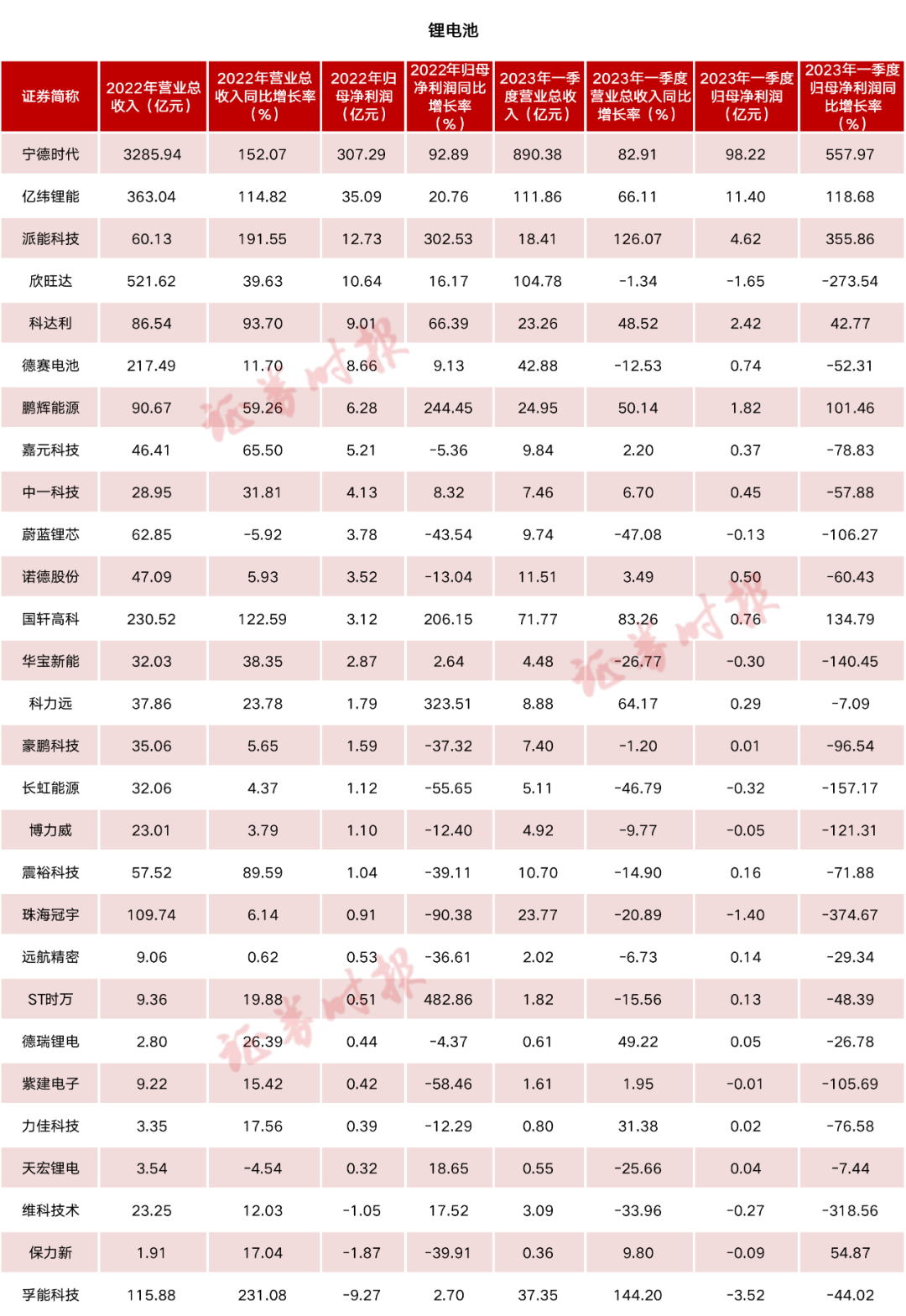 数据显示,A股电池产业链上市公司2022年报和2023年一季报基本已出齐,总体上看,作为一个处于新能源风口的行业,多数上市公司2022年营收和利润同比实现增长。