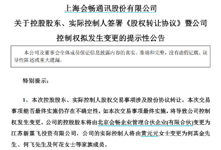5月7日,会畅通讯一纸公告宣布,该公司控股股东北京会畅企业管理合伙企业(有限合伙)(会畅企管)和实控人黄元元拟将以10.53亿元将所持有的27%股份全部予以转让,完成转让后,江苏新霖飞投资有限公司(新霖飞)将入主这家昔日大牛股。