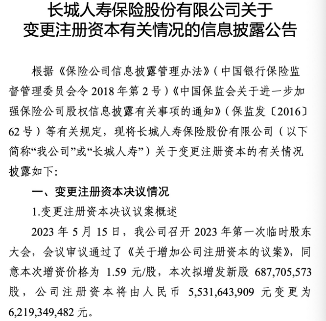 就在今年5月,长城人寿发布了一份增资公告,公司股东大会已审议通过《关于增加公司注册资本的议案》,注册资本将由55.32亿元变更为62.19亿元。