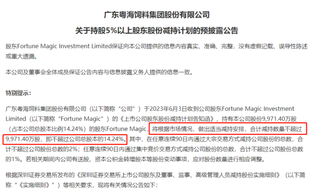 粤海饲料公告,于2023年6月3日收到公司股东Fortune Magic Investment Limited(简称“Fortune Magic”)的《上市公司股东股份减持计划告知函》,持有本公司股份9971.40万股(占本公司总股本比例14.24%)的股东Fortune Magic,将根据市场情况,做出适当减持安排,合计减持数量不超过9971.40万股,即不超过公司总股本的14.24%。