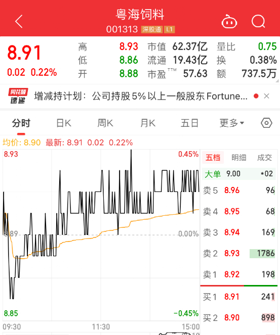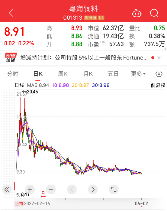 Fortune Magic Investment Limited持有的股份今年2月刚刚解禁,按照粤海饲料最新收盘价8.91元计算,拟减仓市值8.88亿元,接近9亿元。