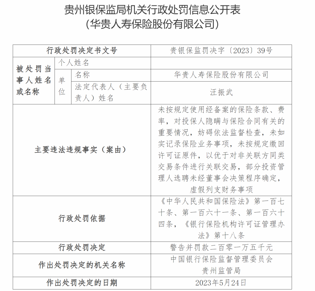 公告显示,2019年1月至2021年8月期间,因华贵人寿存在未按相关监管法律法规使用经备案的保险条款费率、未如实记录保险业务事项等行为,该公司贵州分公司存在未如实记录保险业务事项、未取得任职资格的人员实际履行高管职务等行为,贵州银保监局对该公司予以警告并罚款201.5万元,对相关责任人予以警告并罚款共计67万元;对该公司贵州分公司予以罚款72万元,对相关责任人予以警告并罚款共计9万元,撤销任职资格1人。