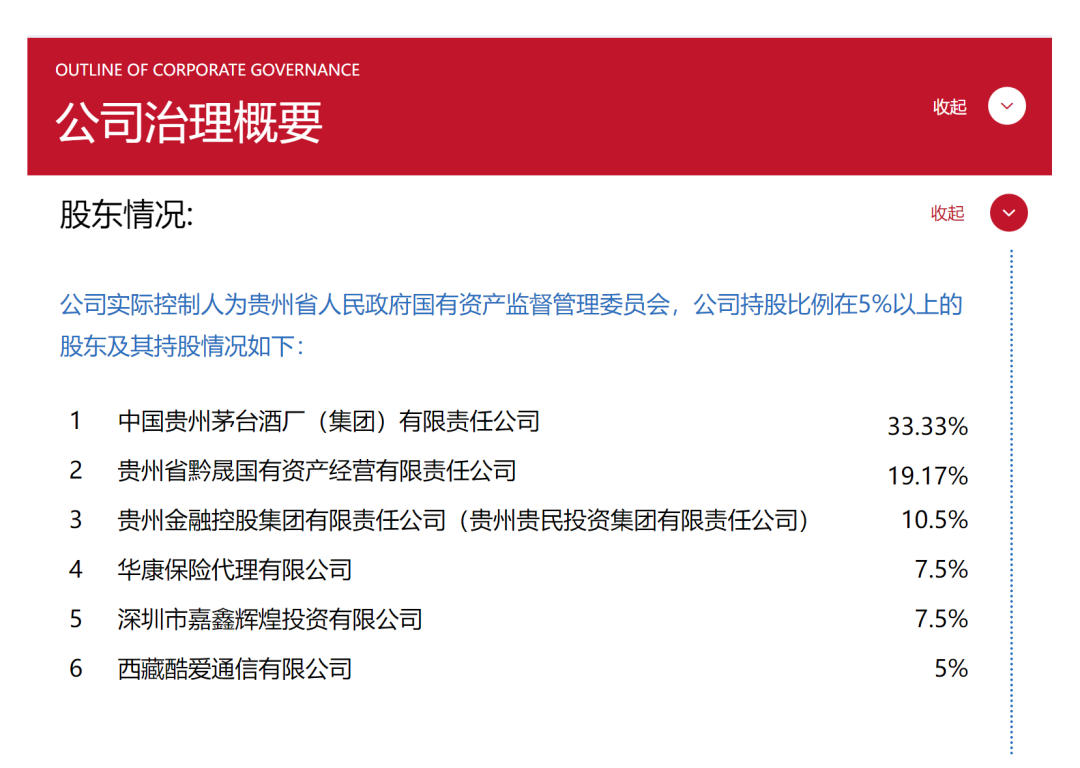 目前,华贵人寿官网已经更新持股比例在5%以上的股东及其持股情况,茅台集团持股比例为33.33%。