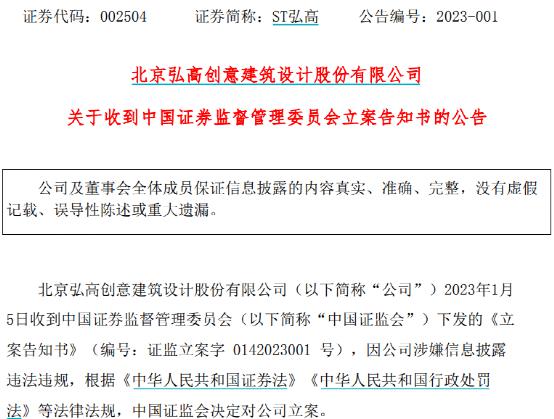 今年1月5日,公司公告称,收到中国证监会下发的《立案告知书》(编号:证监立案字 0142023001 号),因公司涉嫌信息披露违法违规,中国证监会决定对公司立案。