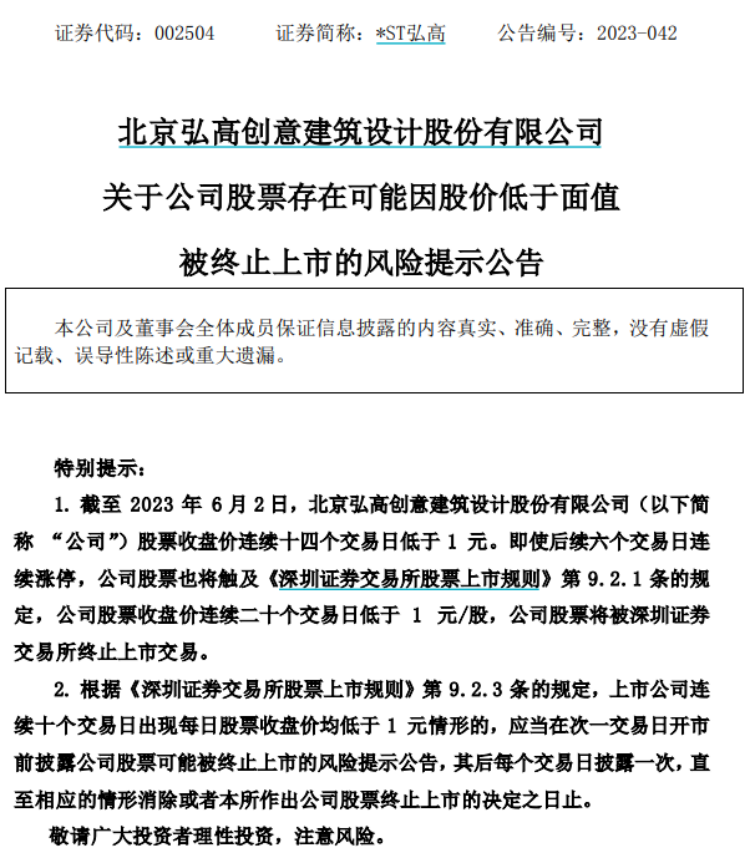 6月4日晚间,*ST弘高(002504)发布公告称,截至6月2日收盘,公司收盘价已连续14个交易日低于1 元,即使后续6个交易日连续涨停,公司股价也无法回到1元及以上。