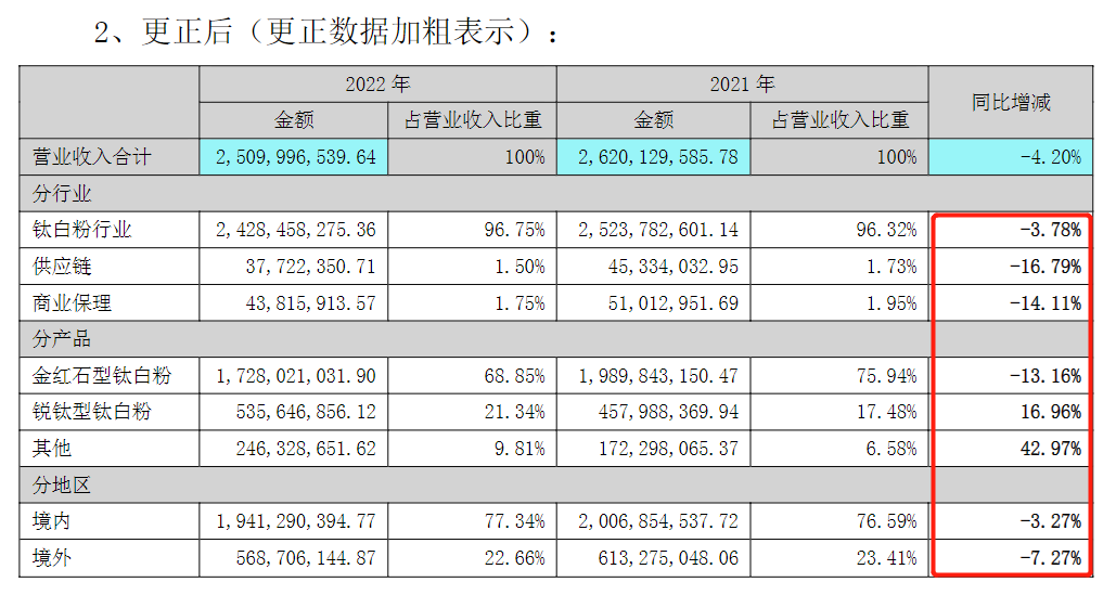 原来,在此前的年报中,金浦钛业工作人员将2022年公司各类产品营业收入的“同比增减”错误计算成“2022年各类产品营收占总营收比重—2021年各类产品营收占总营收比重”,而各类产品2022年营收“同比增减”的正确计算方法应当是“(2022年营收金额—2021年营收金额)÷2021年营收金额×100%”。在更正之后,金浦钛业终于将“同比增减”算对了。