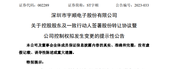 5月30日晚间ST宇顺就曾披露控股股东及一致行动人签署股权转让框架协议的公告,披露了上述股权转让意向。