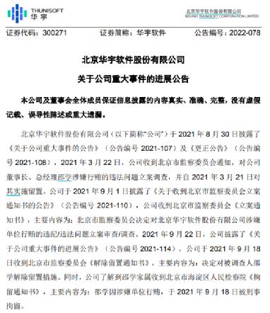 值得一提的是,早在2021年3月22日,华宇软件收到北京市监察委员会通知,对邵学涉嫌行贿的违法问题立案调查。