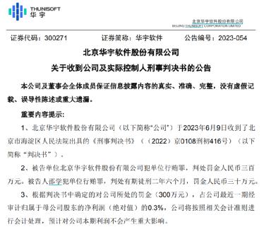 对于上述判决,华宇软件表示,300万元罚金占公司最近一期经审计归属于母公司股东的净利润(绝对值)的0.3%,公司将按照相关会计准则进行会计处理,预计对公司本期利润不会产生重大影响。