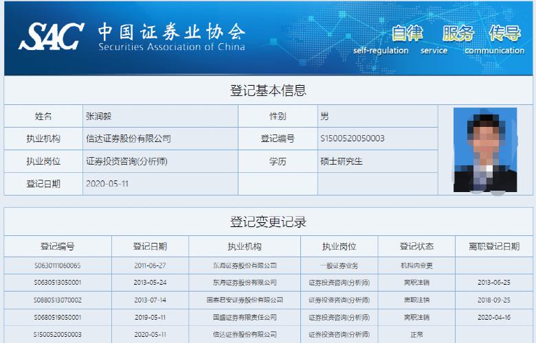 中证协信息显示,张润毅曾在东海证券、国泰君安、国盛证券等券商从事研究业务,其中2013年至2018年在国泰君安研究所工作,工作时间最长。2020年5月加入信达证券,任职至今。