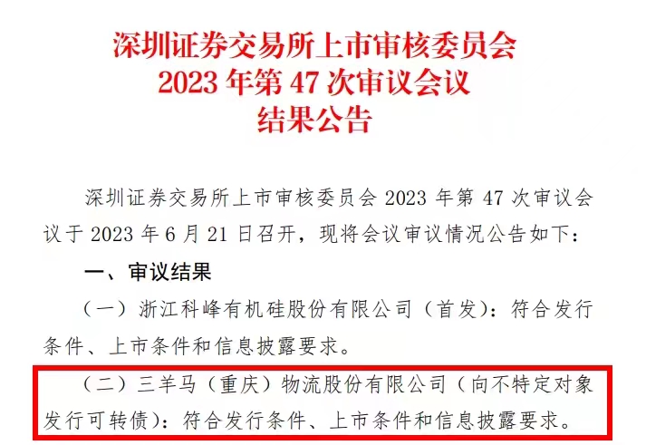 6月21日,深交所上市委员会2023年第47次审议会议结果显示,三羊马(001317)(001317)向不特定对象发行可转债的申请获通过。
