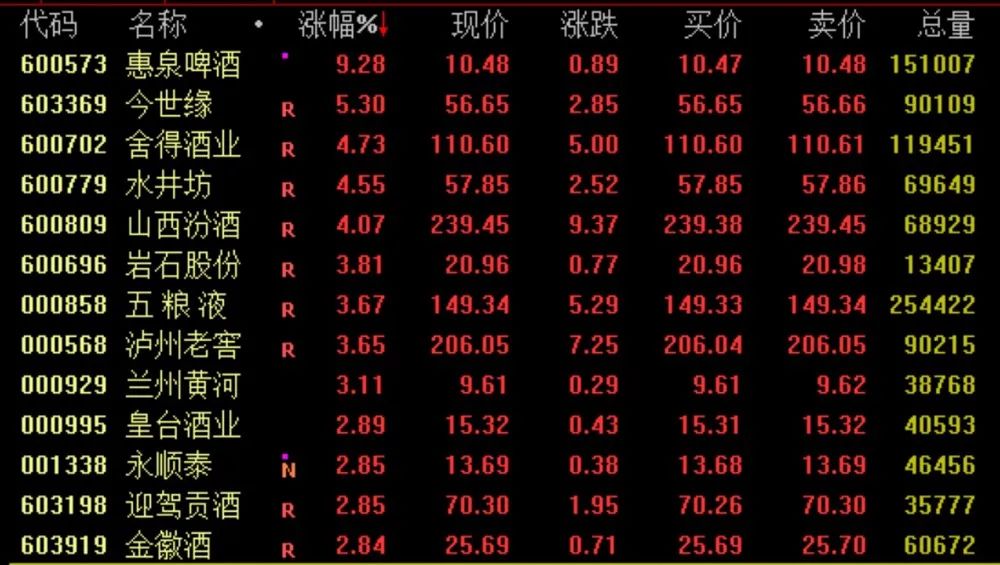 酒类股今日反弹走高,截至收盘,惠泉啤酒涨约9%,今世缘(603369)涨超5%,舍得酒业、水井坊、山西汾酒等涨超4%,五粮液(000858)涨超3%,贵州茅台(600519)涨超2%。