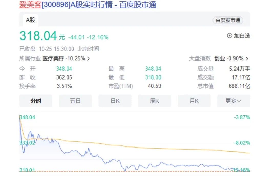 值得注意的是,昨晚刚公布三季报的爱美客开盘即大幅下探,收盘下跌12.16%报318.04元,股价较年初高点已“腰斩”,最新市值688亿元。