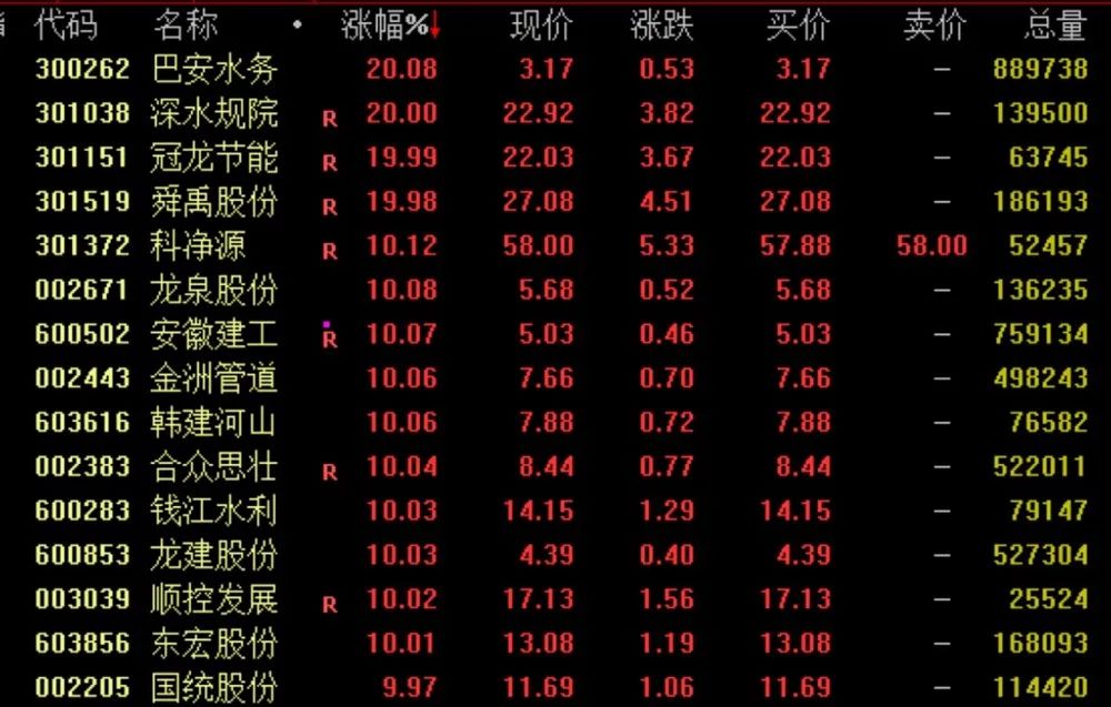 水利板块盘中爆发,个股掀涨停潮。截至收盘,巴安水务、深水规院、冠龙节能、舜禹股份(301519)等“20cm”涨停,龙泉股份(002671)、安徽建工(600502)、金洲管道、钱江水利(600283)等亦涨停。