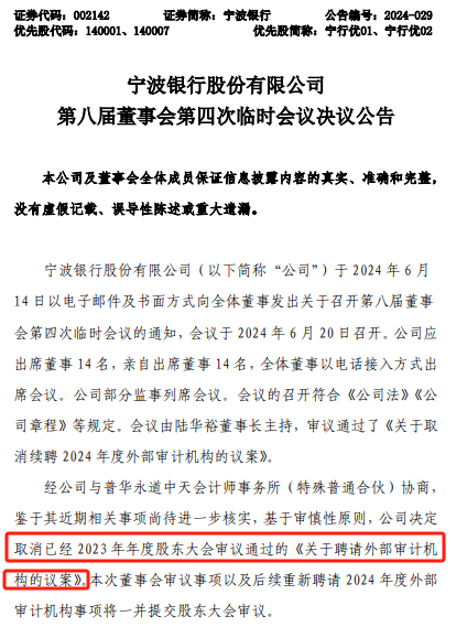 宁波银行今晚的公告称,公司本次董事会审议事项,以及后续重新聘请2024年度外部审计机构事项,将一并提交股东大会审议。