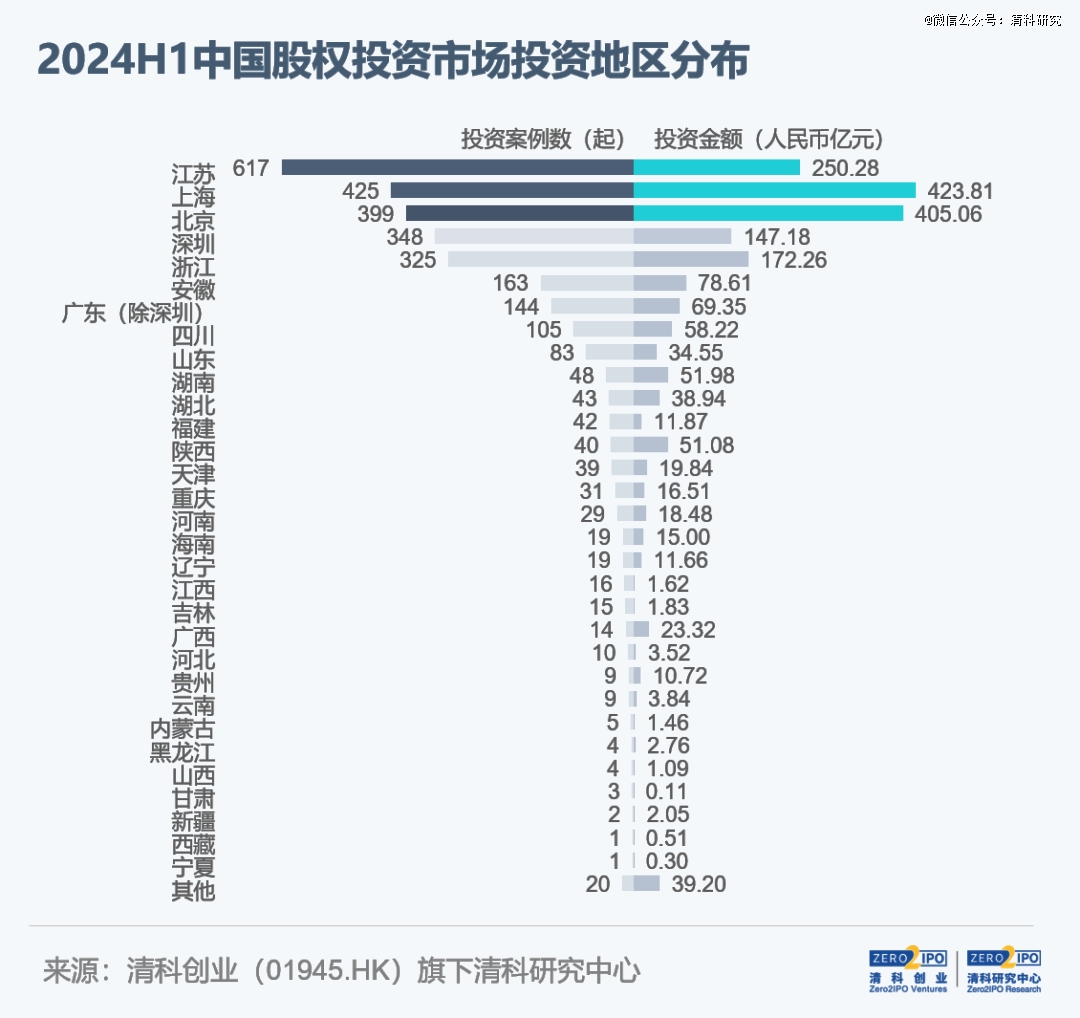 2024年上半年,股权投资地域分布高度聚集。根据清科研究中心统计,江苏、上海、北京、深圳及浙江五地合计发生案例数2,114起,占比69.7%,同比增加1.3个百分点。