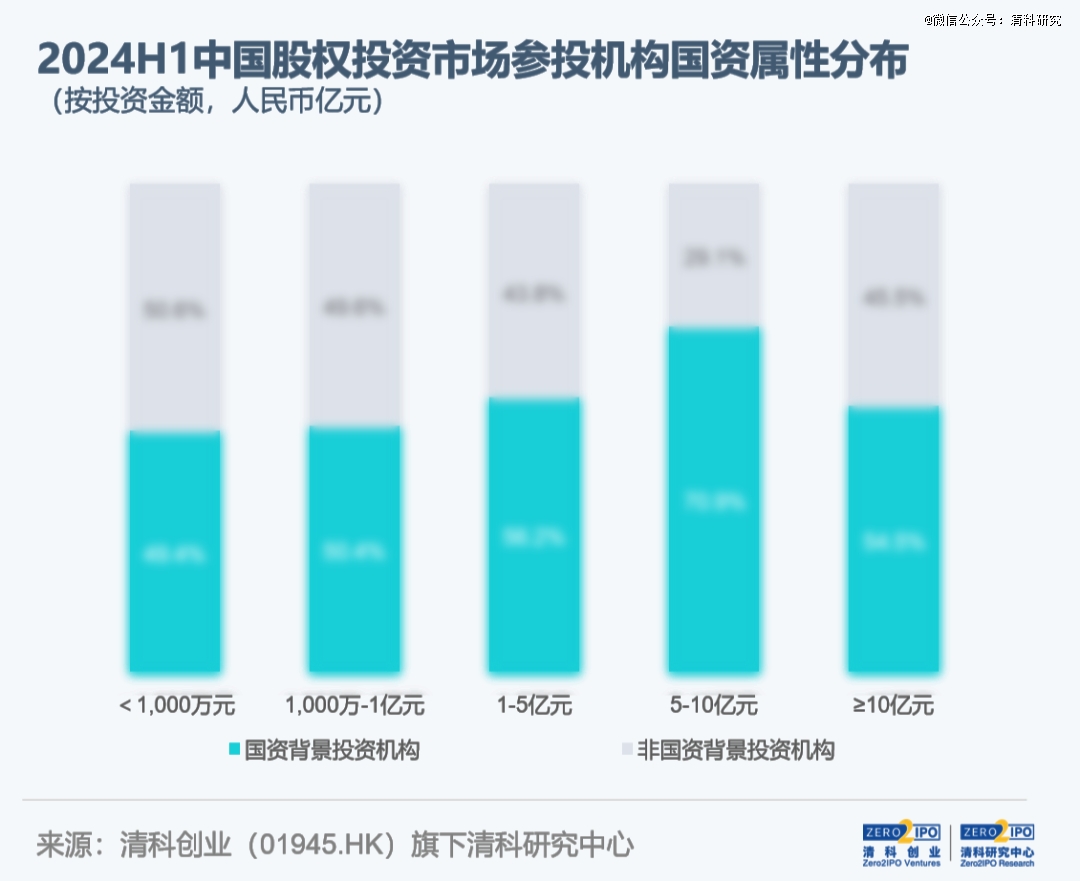 从投资机构背景分析,在产业政策的引导下,国有投资机构在股权投资市场仍占据主导地位。根据清科研究中心统计,2024年上半年,国资背景投资机构的投资金额共计1,025.82亿元人民币,占比为57.0%,与2023年同期基本持平。另外,从投资阶段来看,国资背景投资机构主要投资成熟期和扩张期项目,上半年投资金额占比高达81.2%,较非国资背景投资机构高21.4个百分点。整体来看,国资背景投资机构更加重视国有资本的保值和增值,因此会更加偏好于路径清晰、商业化信号明确的中后期项目。