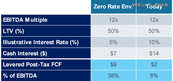 如图3显示,在“上一周期”一笔贷款价值比为50%、EBITDA利润率目标为15%、定价为12倍的并购交易中,利息支出从5%上升到10%,企业将其不到10%的EBITDA转化为自由现金流,与之前零利率环境下的同一企业相比减少了约80%。