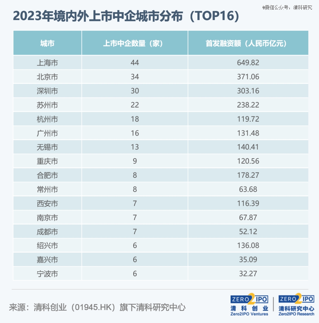 从上市数量来看,江苏和广东均有64家中企上市排名并列*。首发融资额方面,上海以649.82亿元*其他地区,苏、粤两省排名二、三,此外,安徽、重庆、湖南等中西部省份增势显著,上市数量及融资规模均实现较大幅度增长。