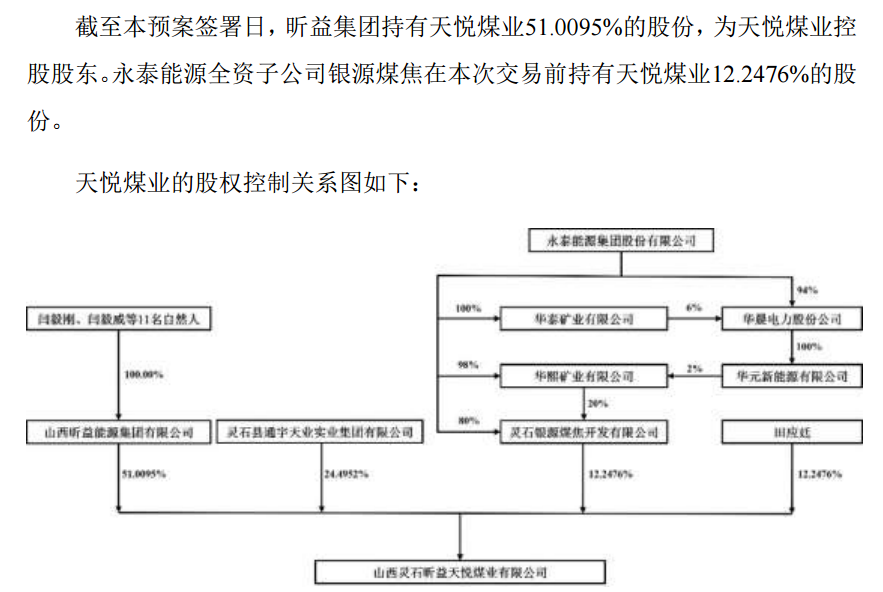 此前,永泰能源全资子公司已持有天悦煤业12.2476%的股权。上述交易完成后,永泰能源将合计持有天悦煤业63.2571%的股权,并将后者纳入财务报表合并范围。