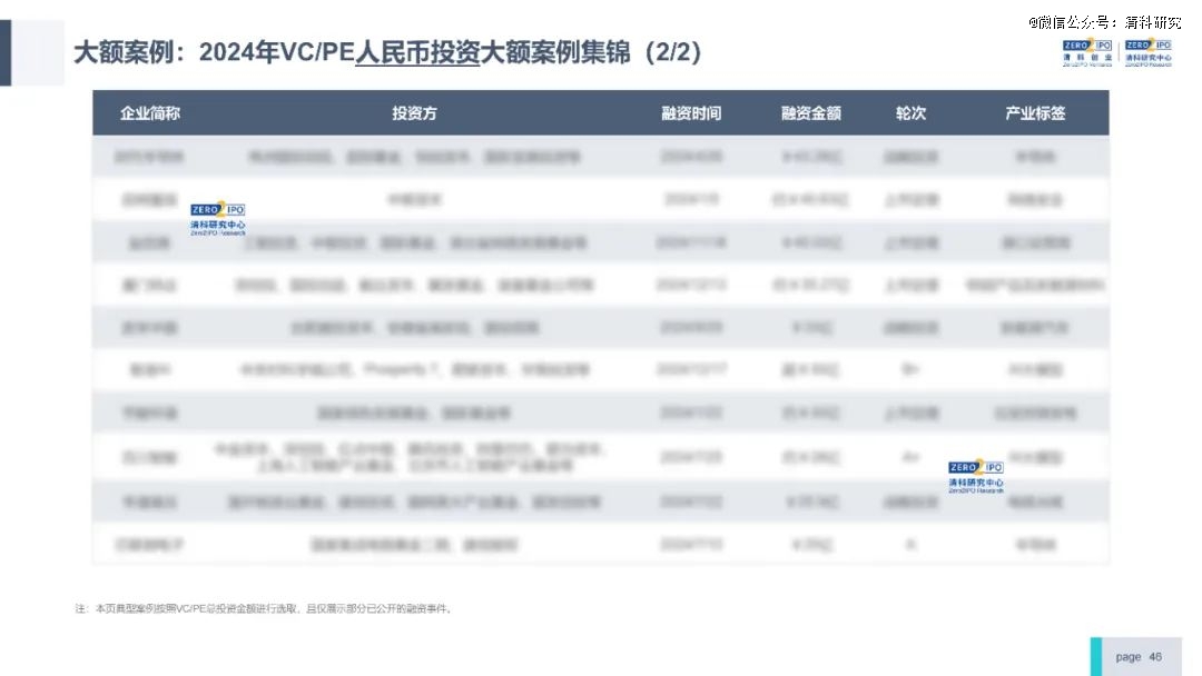 投资方面,2024年投资案例数共8,408起,剔除极值案例后披露金额6,036.47亿元,同比降幅分别为10.4%、10.3%,与前三季度相比进一步收窄。分行业看,硬科技领域仍为市场热点,半导体及电子设备领域获投金额超千亿,机械制造领域案例数及金额逆势上涨。