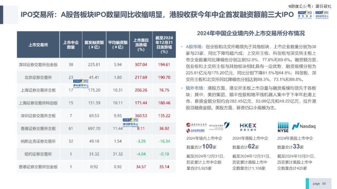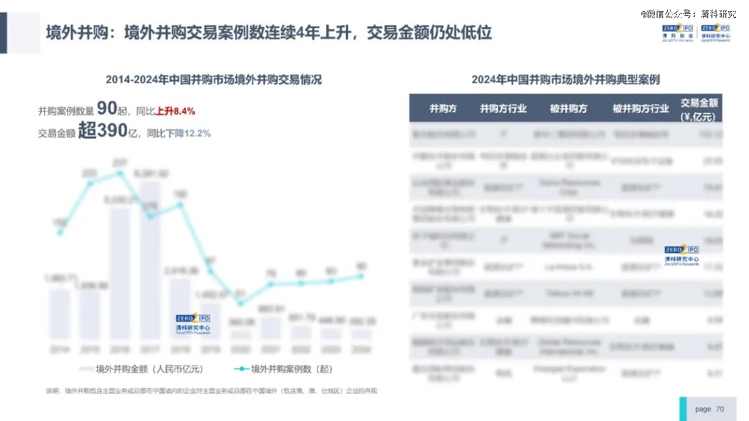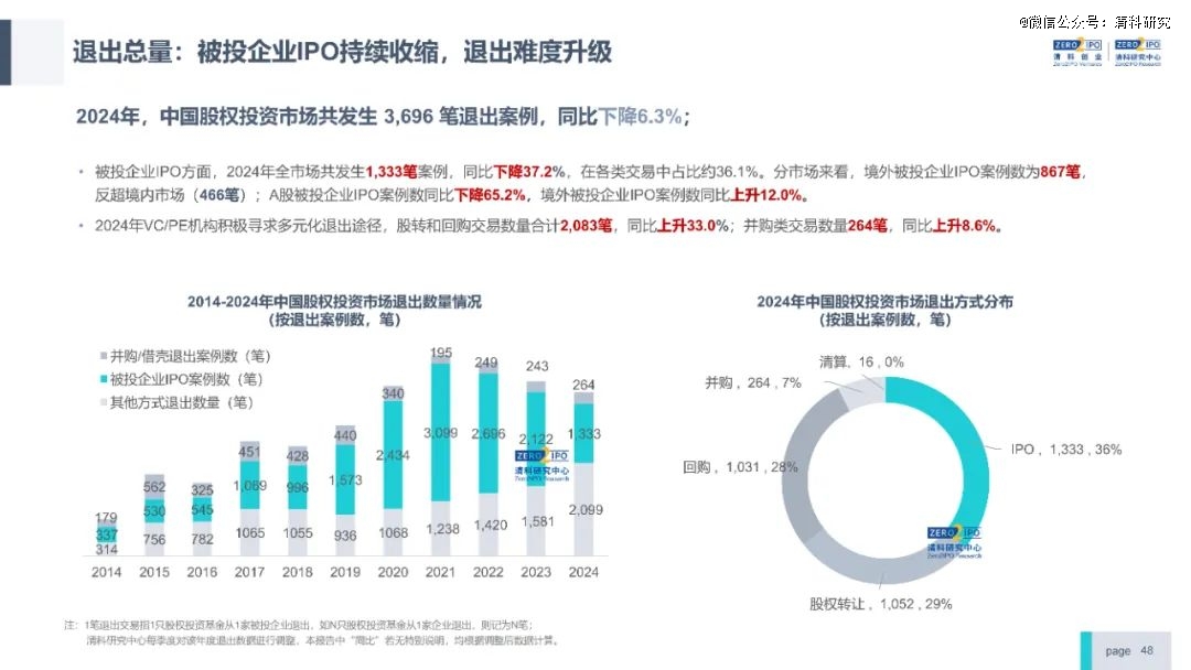 退出方面,2024年共发生3,696笔退出案例,同比下降6.3%,其中被投企业IPO案例数为1,333笔,占比36.1%。值得注意的是,2024年境外被投企业IPO案例数为达到867笔,同比上升12.0%,中企境外市场IPO逐步回暖。