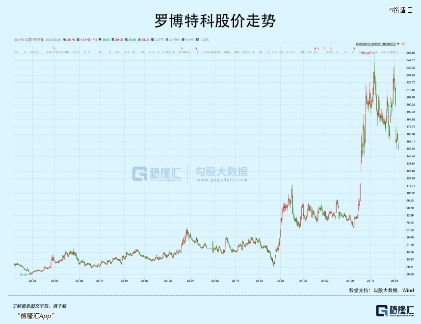 近几年,罗博特科是A股少有的大牛股,股价从2022年4月的*20.1元,一路飙到2024年11月的最高255元,暴涨近12倍。