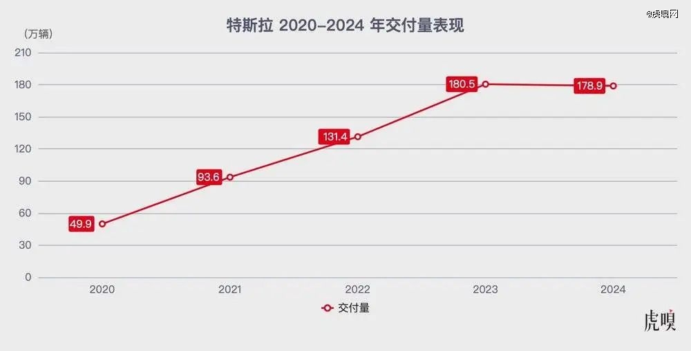 特斯拉近五年交付量表现,2024 年出现了下滑