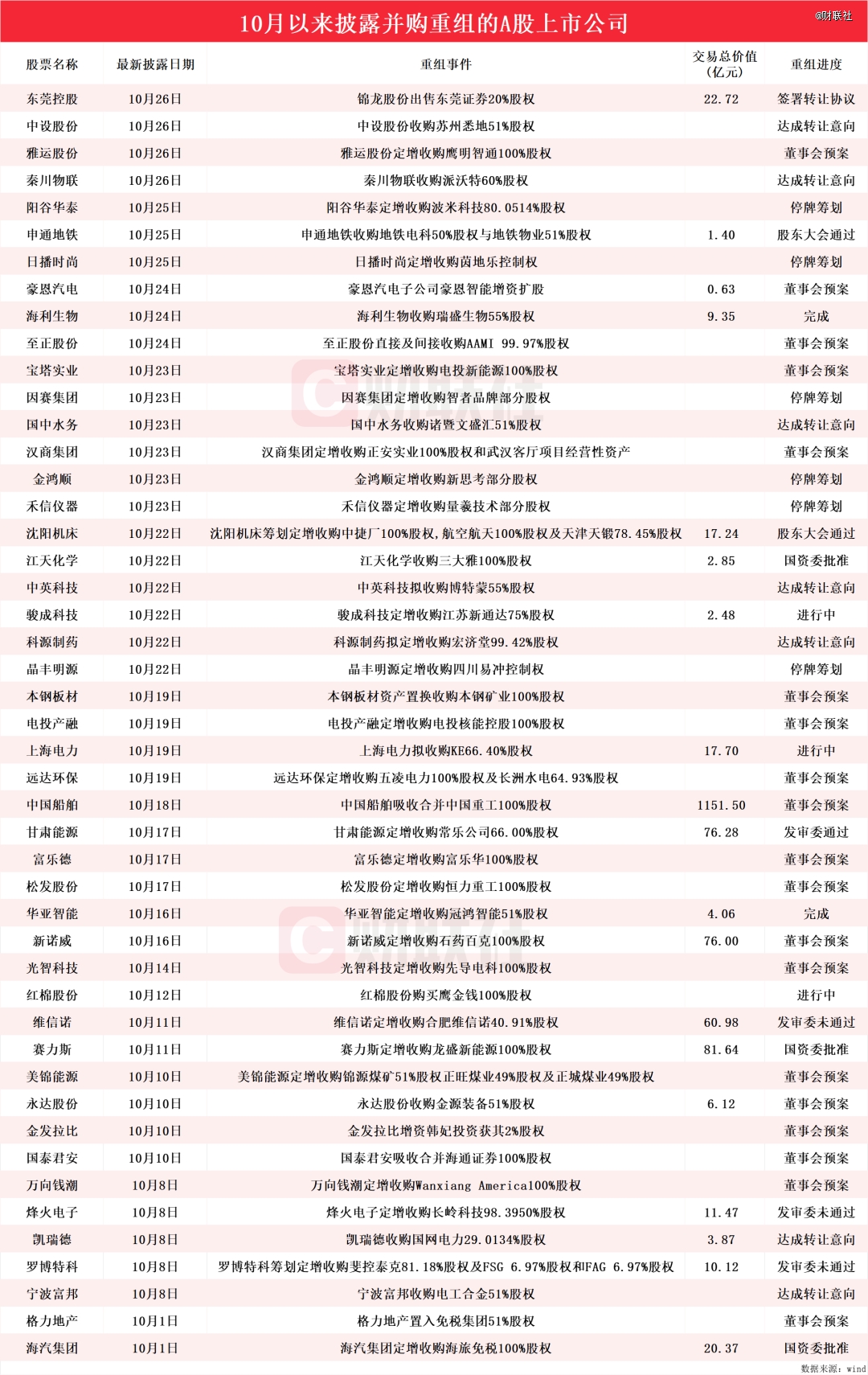 据Wind数据统计,剔除重组失败、出让方、ST股,10月以来披露并购重组进展的A股上市公司共有47家,分别为东莞控股、中设股份、雅运股份、秦川物联、阳谷华泰、申通地铁、日播时尚、豪恩汽电、海利生物、至正股份、宝塔实业、因赛集团、国中水务、汉商集团、金鸿顺、禾信仪器、沈阳机床、江天化学、中英科技、骏成科技、科源制药、晶丰明源、本钢板材、电投产融、上海电力、远达环保、中国船舶、甘肃能源、富乐德、松发股份、华亚智能、新诺威、光智科技、红棉股份、维信诺、赛力斯、美锦能源、永达股份、金发拉比、国泰君安、万向钱潮、烽火电子、凯瑞德、罗博特科、宁波富邦、格力地产和海汽集团。具体情况如下图: