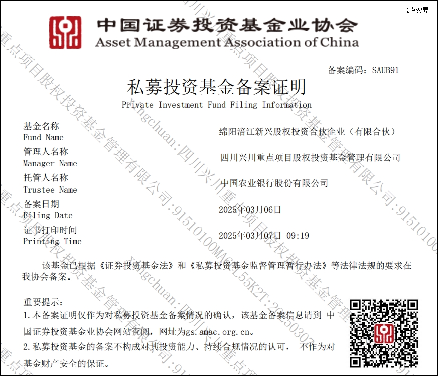 投资界(ID:pedaily2012)3月10日消息,近日,由四川兴川管理的绵阳涪江新兴股权投资基金合伙企业(有限合伙)正式通过中国证券投资基金业协会备案 。