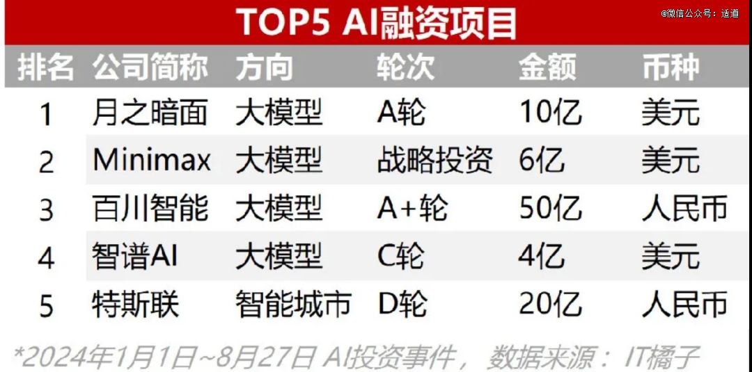 桔子IT数据显示,2024年前9个月,国内AI领域发生了317起融资案例,月均融资金额42亿元,不到去年的两成。其中,融资最多的5家公司拿走了超212亿,相当于今年国内AI融资总额的63%。