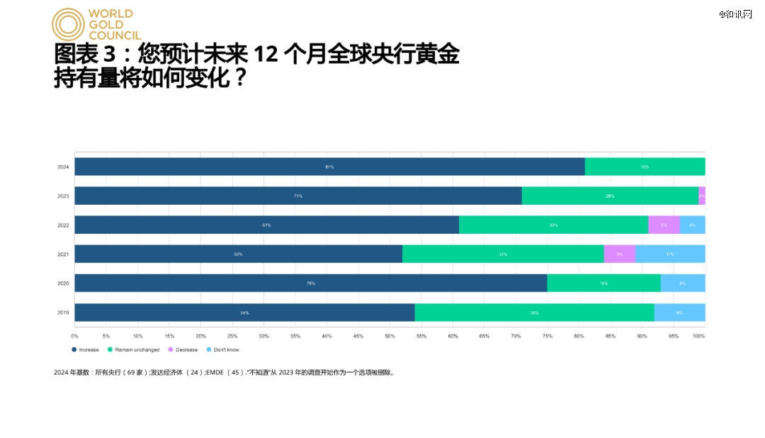 对于未来央行能否保持增持黄金的热情,世界黄金协会在2024年央行黄金储备调查报告中指出,通过梳理70份有效调查回复,有29%的央行受访者计划在未来12个月内增加黄金储备,而这一比例是2018年开始此项调查以来的最高水平。同时这份报告还指出,有81%的央行受访者认为未来12个月全球各国央行黄金持有量将进一步增加。