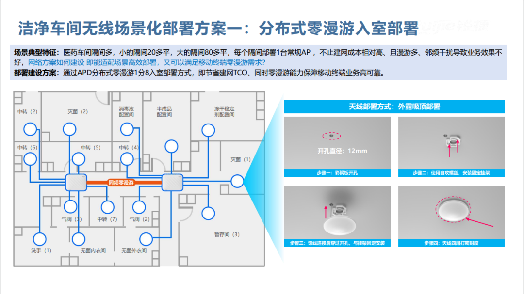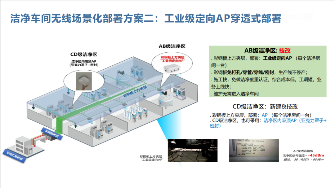 洁净车间环境要求极高,普通无线设备难以适配。锐捷网络洁净车间方案在车间外部署分布式零漫游 AP,利用馈线将信号引入车间内部。某知名药企采用该方案后,成功解决传统 AP 部署设备多、成本高且不合规的问题,保障了车间内设备无线传输稳定,确保数据采集和指令传输顺畅。