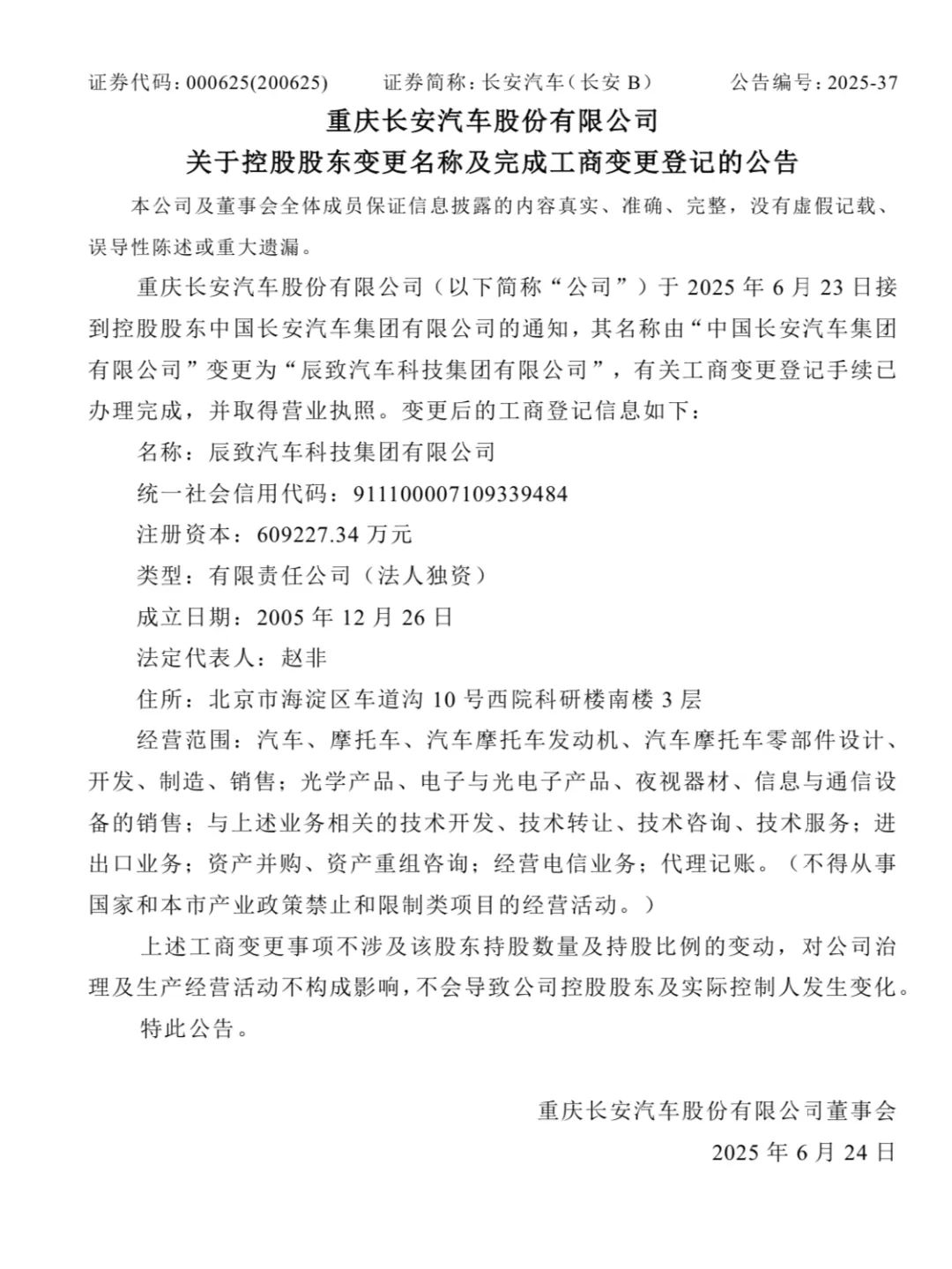 6月23日晚间,重庆长安汽车(000625)股份有限公司(以下简称“长安汽车”;000625)发布公告称,公司接到控股股东中国长安汽车集团有限公司通知,其名称由“中国长安汽车集团有限公司”变更为“辰致汽车科技集团有限公司”,并已完成工商变更登记手续。