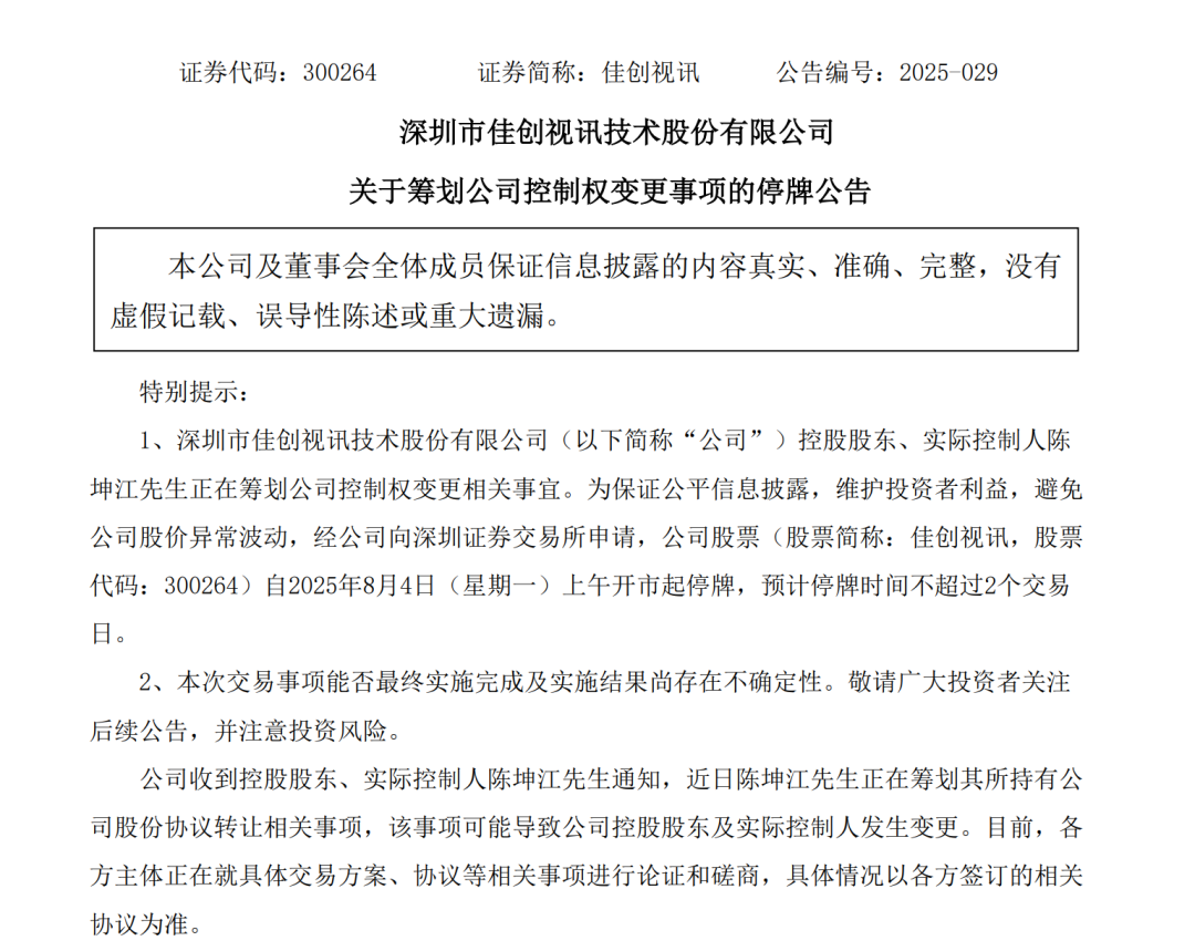 佳创视讯8月3日晚间公告,陈坤江正在筹划公司控制权变更相关事宜。为保证公平信息披露,维护投资者利益,避免公司股价异常波动,经公司向深交所申请,公司股票自8月4日(星期一)上午开市起停牌,预计停牌时间不超过2个交易日。