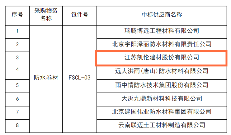 近日,中铁三局集团有限公司(下称“中铁三局”)2025年度区域集中采购防水材料中标结果公布,凯伦股份(300715)凭借专业的系统服务和品牌认可度成功中标。