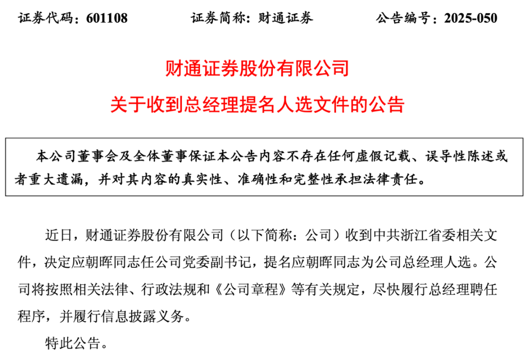 财通证券最新发布的公告显示,近日,公司收到中共浙江省委相关文件,决定应朝晖同志任公司党委副书记,提名应朝晖同志为公司总经理人选。公司将按照相关法律、行政法规和《公司章程》等有关规定,尽快履行总经理聘任程序,并履行信息披露义务。