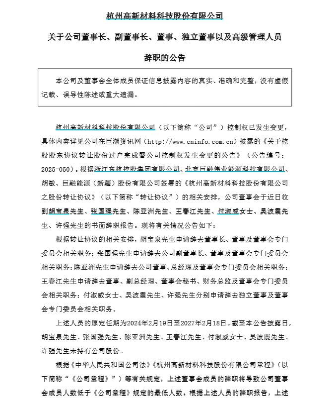 9月4日晚间,杭州高新(300478)发布公告称,由于公司控制权已发生变更,胡宝泉、张国强、陈亚洲、王春江、付淑威、吴波震、许强等七人因股份转让协议安排申请辞去相关职务。