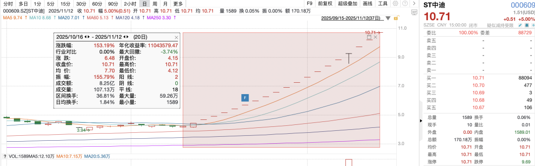 数据显示,ST中迪股价自10月16日至11月12日期间,累计涨幅高达153.19%,其间更是出现七次股价异常波动。这种剧烈的股价波动与公司基本面形成鲜明对比。截至11月11日,ST中迪静态市盈率为-12.83倍,滚动市盈率为-15.88倍,市净率为-376.33倍,而同期中国上市公司协会行业分类房地产业的静态市盈率为28.62倍,滚动市盈率为26.19倍,市净率为0.93倍。公司各项估值指标与行业平均水平存在严重偏离,显示出股价波动严重背离公司基本面。