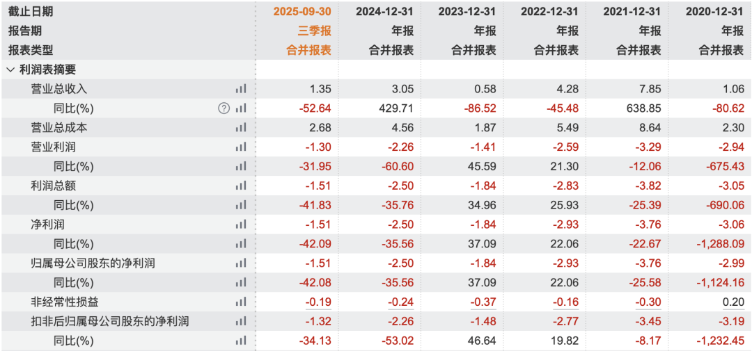 尽管股价大幅上涨,但ST中迪的经营状况依然严峻。根据公司披露的财务数据,2025年前三季度,该公司营业收入为1.35亿元,同比下降52.64%;利润总额为-1.51亿元,同比下降41.83%。更为严峻的是,ST中迪2022年度、2023年度、2024年度三个会计年度扣除非经常性损益前后净利润孰低者均为负值,且2024年度审计报告显示公司持续经营能力存在重大不确定性。这导致公司股票被继续实施其他风险警示。
